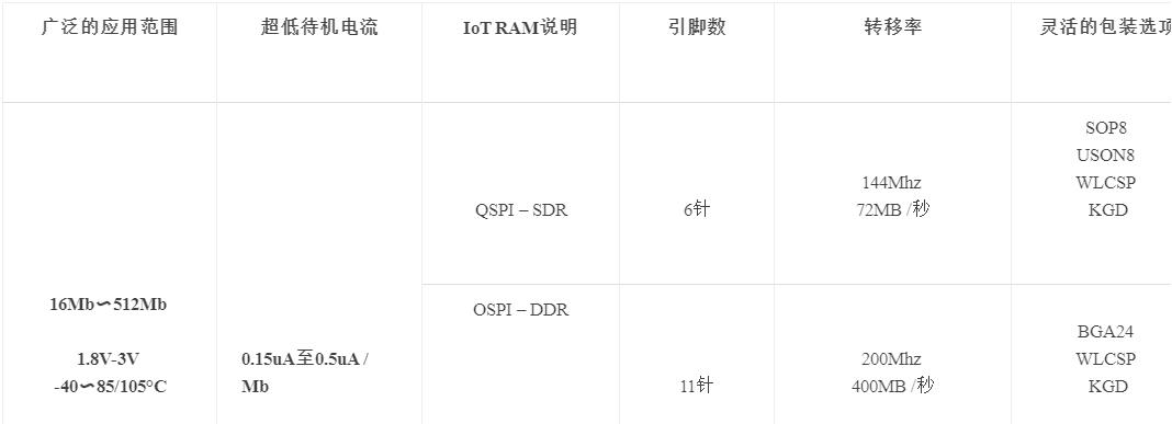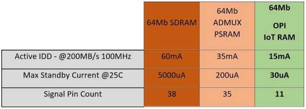 ram替換DRAM,消除了對外部刷新控制器的需求,這降低了接口的復雜性和相關的驗證成本,利用了外部SPI接口的使用,同時保持了最新IoT應用程序所要求的高性能水平,并降低整個系統(tǒng)的功耗。有些基于MCU的舊系統(tǒng)仍在使用SDRAM,在降低功耗和簡化接口方面,可以受益于IoT RAM的使用。下表清楚顯示了待機電流和有功電流的優(yōu)點,同時保持了相當?shù)膫鬏斔俾省?/div>