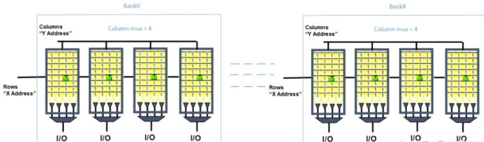 這些SRAM cell集合成如下圖的多個bank的memory block,每個bank有bank address使能;在一個bank內(nèi)Row address選擇一個完整的wordline,Column address選擇某組IO bitlines。