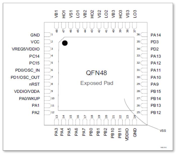國產(chǎn)32位單片機MM32SPIN360C擁有M0內核的高性能32位微控制器,5V輸出的LDO穩(wěn)壓器、三組具備有自舉二極管的N通道半橋柵極驅動器。MCU最高工作頻率可達96MHz,并內置SRAM高速存儲器,增強豐富型I/O端口和外設連接到外部總線。采用QFN48封裝形式。本產(chǎn)品包含2個12位的ADC、3個比較器、3個運算放大器、1個16位通用定時器、1個32位通用定時器、3個16位基本定時器、2個16位高級定時器。還包含標準的通信接口:1個I2C接口、1個SPI接口和2個UART接口。