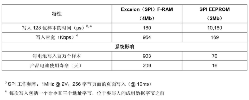 FRAM和EEPROM寫入數據所需的能量。可以看出對于這種應用而言,FRAM消耗的功耗顯著降低。極低功耗深度待機模式和休眠模式可進一步改善功耗,從而進一步延長設備的電池使用壽命。