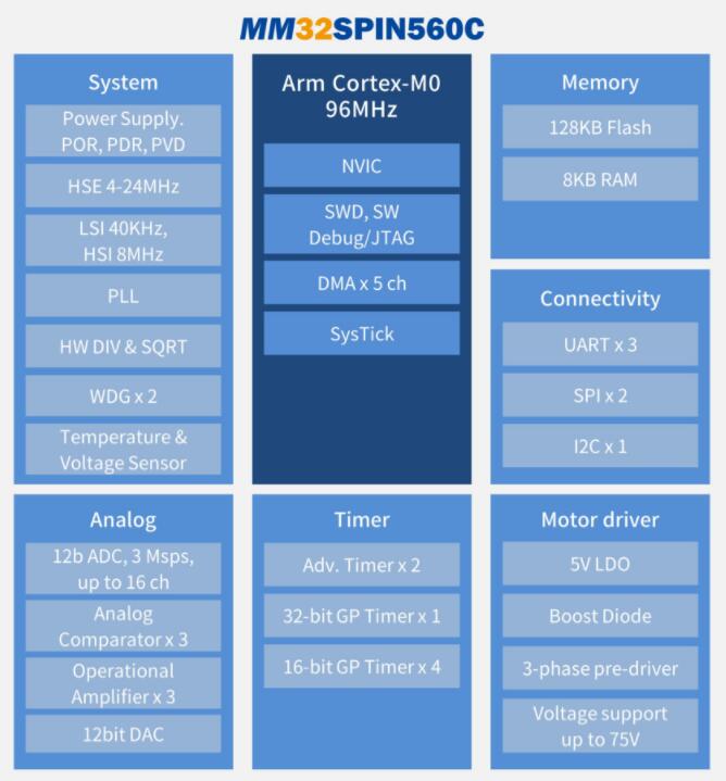 MM32SPIN560C內(nèi)部集成了一部分驅(qū)動(dòng)電路,所以方案外圍電路比較簡(jiǎn)單。該方案適用于多種應(yīng)用場(chǎng)合,如空氣凈化器、服務(wù)器風(fēng)機(jī)、吊扇、落地扇、電動(dòng)手工具、吸塵器、無人機(jī)電調(diào)、小型水泵等。