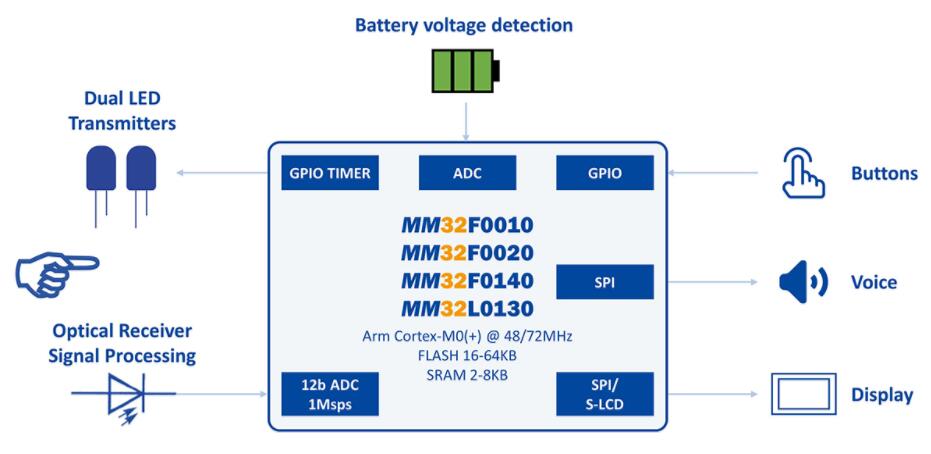 -MM32L0130集成了段碼LCD控制器,且待機(jī)功耗可低至100nA,可進(jìn)一步降低血氧儀的整體功耗,實(shí)現(xiàn)更長久和易用的用戶體驗(yàn)