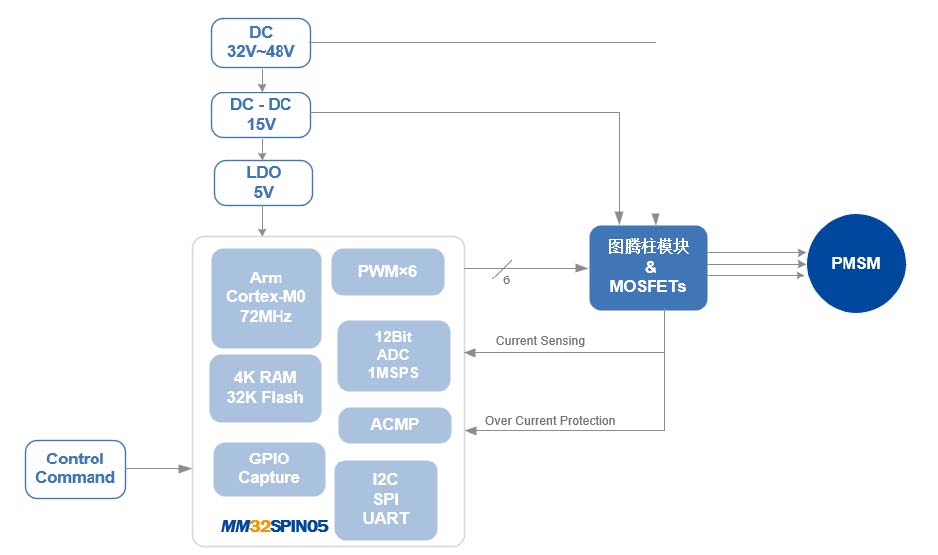MM32SPIN080C是靈動(dòng)MindSPIN旗下高性能的單電機(jī)控制SOC產(chǎn)品,采用Cortex-M0內(nèi)核,集成了運(yùn)動(dòng)控制所需的專用模擬外設(shè),包括12位高精度ADC、2路模擬比較器COMP、2路運(yùn)算放大器OPAMP、三相N溝道柵極驅(qū)動(dòng)器,另配備有MC-TIM、硬件除法器HW-Div、DMA控制器等專用資源,以及32KB Flash、4KB SRAM、20個(gè)GPIO等基礎(chǔ)資源。