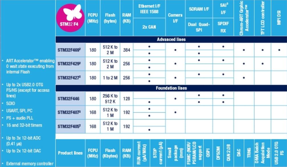 STM32F407/417–168MHzCPU/210DMIPS,高達(dá)1MB的閃存,添加了以太網(wǎng)MAC和攝像頭接口