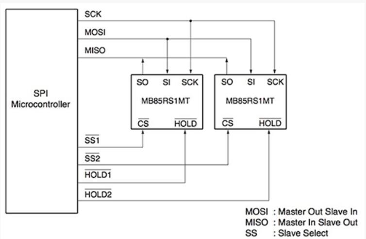 圖1:設(shè)備,如富士通MB85RS1MT允許使用熟悉的主/從配置為SPI-配備的MCU - 或使用使用設(shè)備的SI和SO端口,用于非基于SPI的設(shè)計(jì),簡單的總線連接解決方案。 (富士通半導(dǎo)體提供)