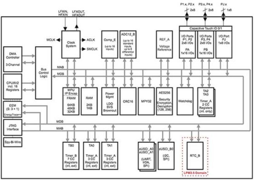 TI的MSP430FR5969是該公司低功耗MCU具有實(shí)質(zhì)性芯片F(xiàn)RAM存儲(圖2)。在主動模式下,