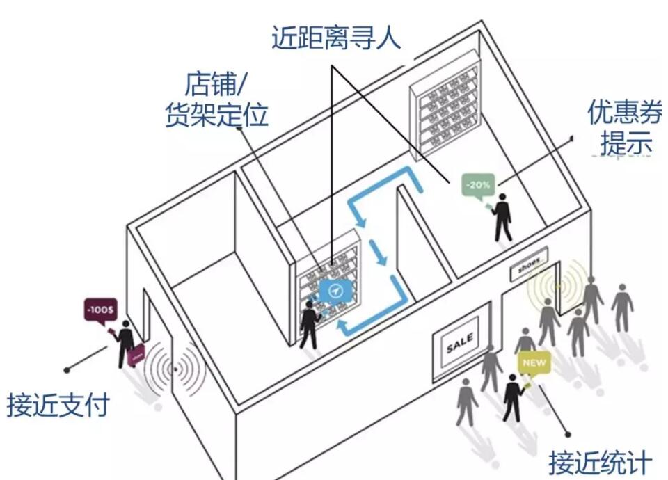 基于位置的服務(wù)(LBS)成為互聯(lián)網(wǎng)巨頭在實(shí)現(xiàn)O2O的重要手段。BLE的廣播信號是每一臺手機(jī)都可以收到的信號,一個(gè)顧客在接近商鋪時(shí)就可以收到商家推廣廣告。在微信中的搖一搖“周邊”中,主要采用這種技術(shù)。