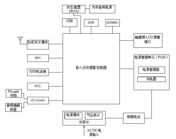 圖1. 這是現代POS終端的框圖。所使用的存儲器包括閃存、SRAM、DRAM和SD/MMC插槽。