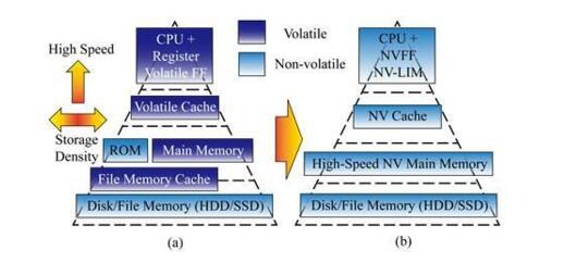圖1 傳統存儲體系結構(a),新型“萬能存儲器”存儲體系結構(b)